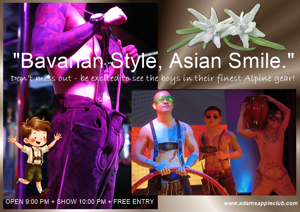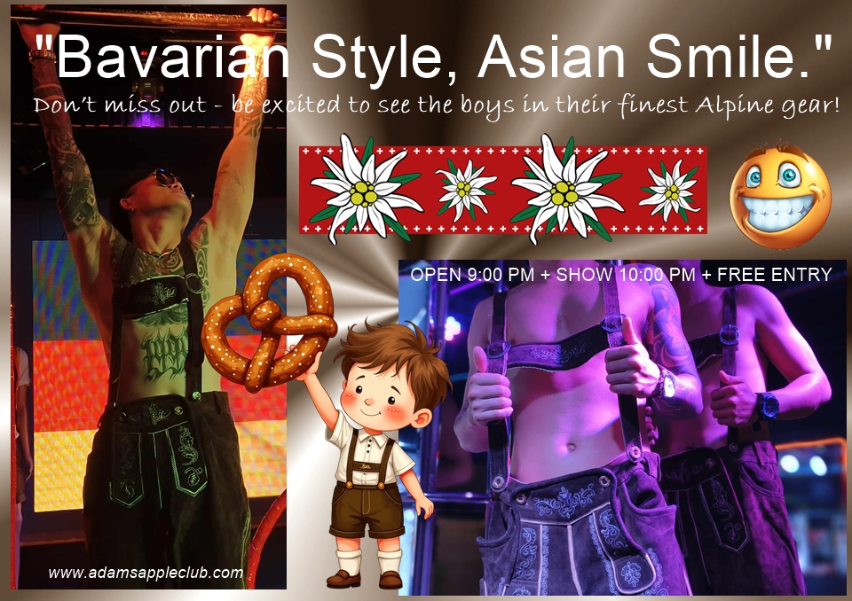 Let yourself go and experience something unforgettable at Adams Apple Club Chiang Mai! Imagine our amazing Asian guys rocking authentic Bavarian lederhosen – yes, they look absolutely fantastic!