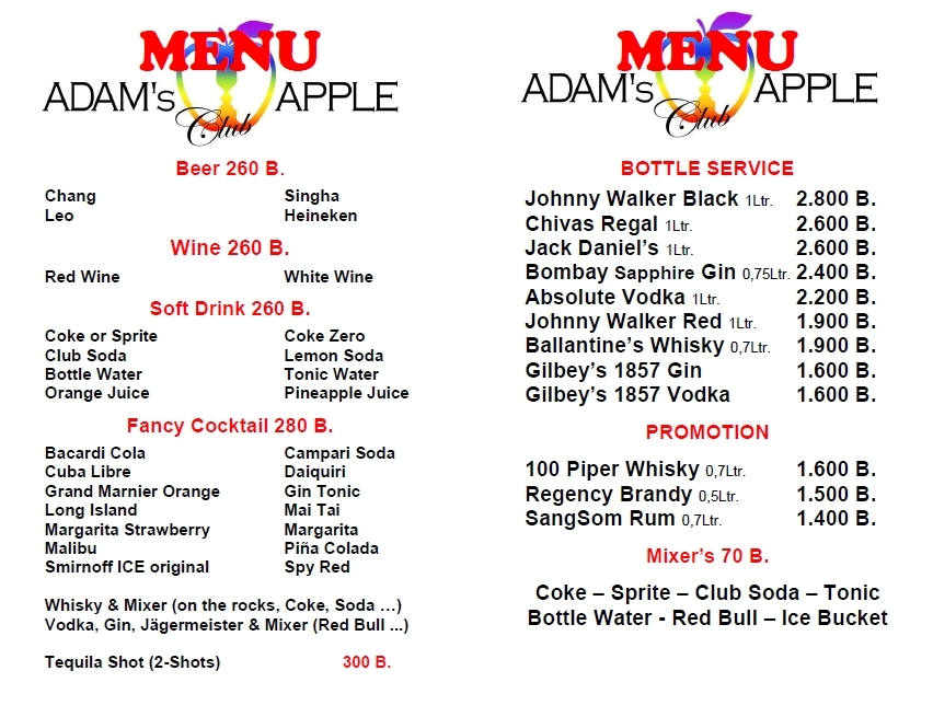 Beverage Menu Adams Apple Club Chiang Mai, here you can get an overview of the drinks we serve at our LGBT Nightclub