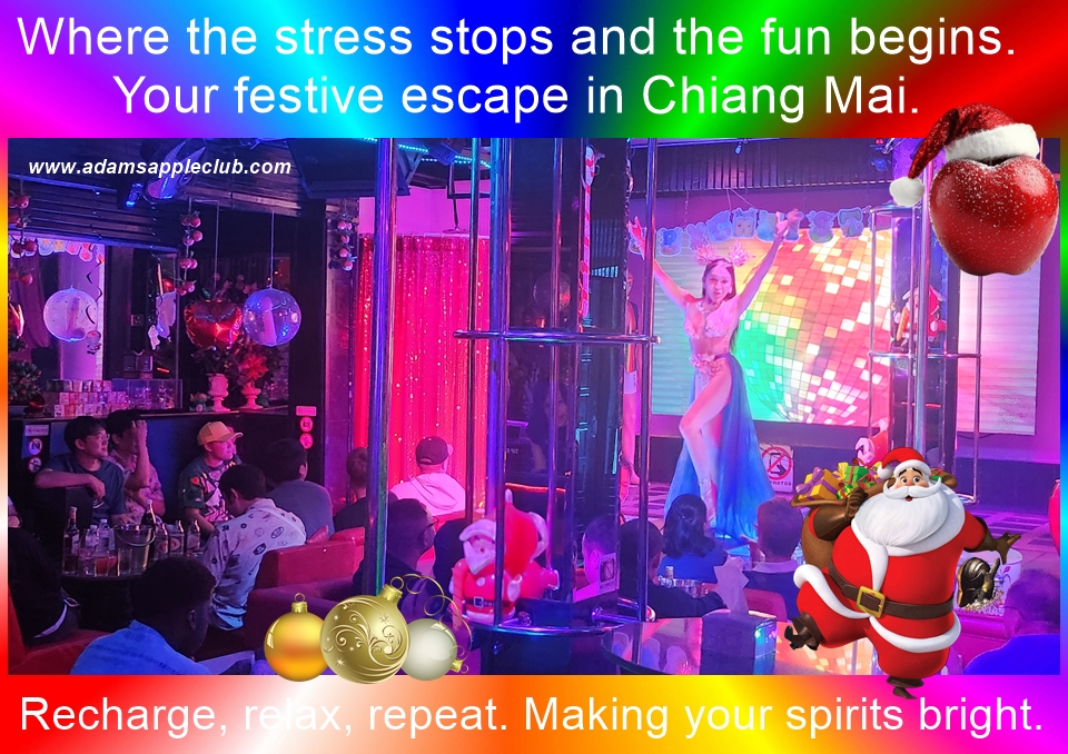 Looking for a place to unwind and lift your spirits during this busy pre-Christmas season? The Adams Apple Club in Chiang Mai is the perfect spot to recharge your batteries! Step inside, leave your worries at the door, and soak up the positive vibes. Whether you’re seeking a night of fun, laughter, or simply a break from the holiday stress, everyone is welcome to relax and refresh in our vibrant, inclusive atmosphere. Make time for yourself – you deserve it! See you at Adams Apple Club, where joy and energy await!