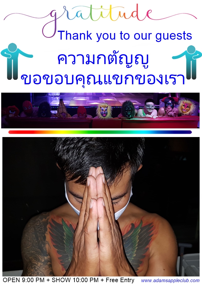 เราขอขอบคุณแขกที่น่าทึ่งของเราจากก้นบึ้งของหัวใจที่มาเยี่ยมชม โชว์บาร์ อดัมส์ แอปเปิล คลับ ของเราในเชียงใหม่ เราหวังว่าคุณทุกคนจะมีค่ำคืนที่แสนวิเศษและน่าจดจำ และขอให้คุณเพลิดเพลินกับการแสดงของเรา เราจะมีความสุขมากหากคุณจะมาเยี่ยมเราอีกครั้งในเร็ว ๆ นี้ รายการใหม่ที่น่าตื่นเต้นและหนุ่มหล่อมากมายรอคุณอยู่