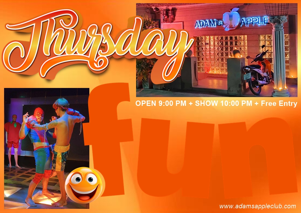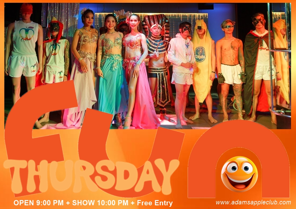 ที่ Adam’s Apple Club เราเฉลิมฉลองพลังบวกของวันพฤหัสบดีด้วยโชว์คาบาเร่ต์สุดอลังการที่เต็มไปด้วยสีสันและรอยยิ้ม มาสัมผัสบรรยากาศที่เป็นกันเองและโชว์ระดับโลกได้คืนนี้!