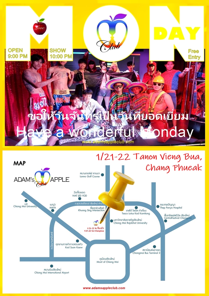 อดัมแอ๊ปเปิ้ลคลับเป็นคลับที่มีชื่อเสียงและเปิดบริการมายาวนานของเชียงใหม่ ตั้งอยู่บนถนนเวียงบัว เขตช้างเผือก ด้านเหนือของตัวเมืองเชียงใหม่ เข้าซอยซ้ายมือจากถนนช้างเผือก อดัมแอ๊ปเปิ้ลคลับจะอยู่ตรงข้ามกับ อดัมแอ๊ปเปิ้ลคลับ เชียงใหม่ใกล้ๆกันกับตลาดธานินทร์