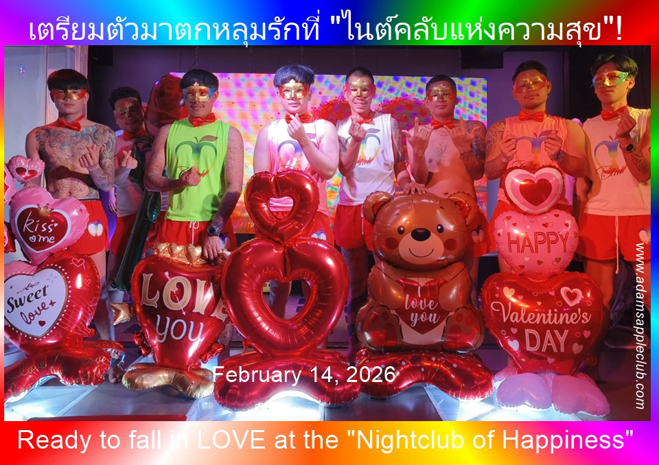 มาฉลองวันวาเลนไทน์ 2026 ที่ Adams Apple Club เชียงใหม่กัน! – เตรียมตัวมาตกหลุมรักที่”ไนต์คลับแห่งความสุข”! 💘✨ วาเลนไทน์ 2026 นี้ มาร่วมฉลองค่ำคืนสุดโรแมนติกที่ Adam’s Apple Club เชียงใหม่ พบกับโชว์คาบาเร่ต์ระดับโลกและการแสดงสุดอลังการที่จะทำให้หัวใจคุณเต้นแรง! 🌹 ไม่ว่าจะมาเป็นคู่หรือมาหา “เพื่อนใหม่” เหล่า Cupid Boys และ Drag Queen ตัวแม่ของเราพร้อมต้อนรับทุกคนด้วยรอยยิ้มและความสนุกแบบจัดเต็ม